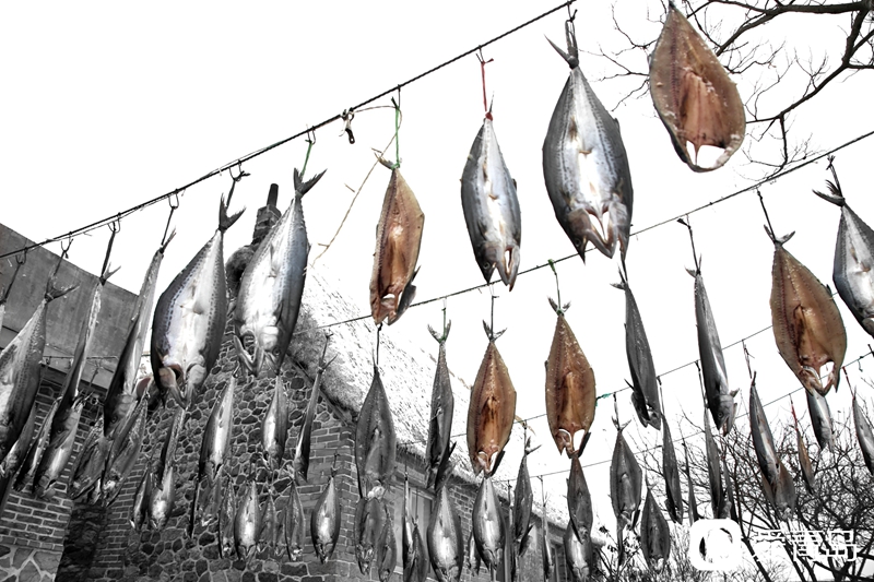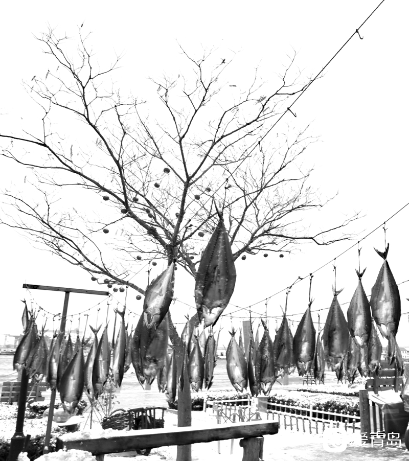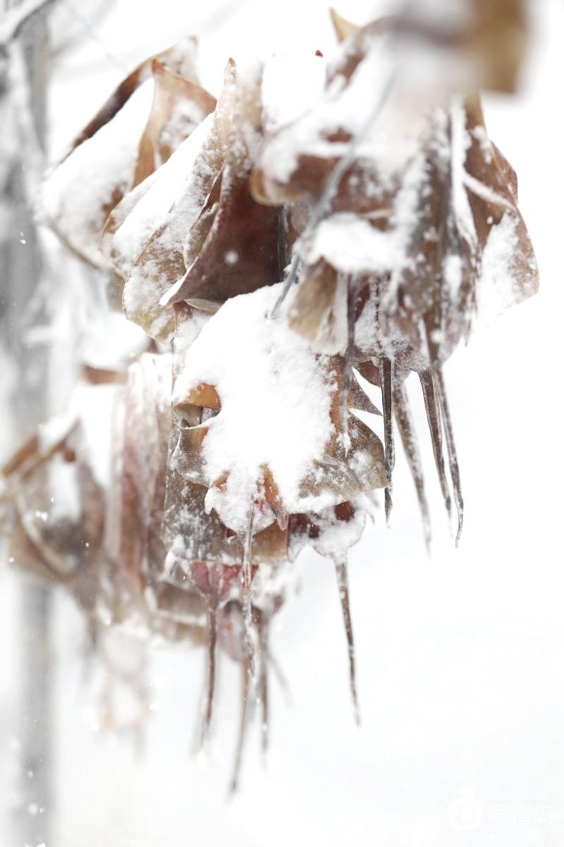 刚刚晒好作为年货的鱼干,覆盖上了一层薄薄的雪,像是上了一层甜甜的糖霜看起来更加可口诱人。