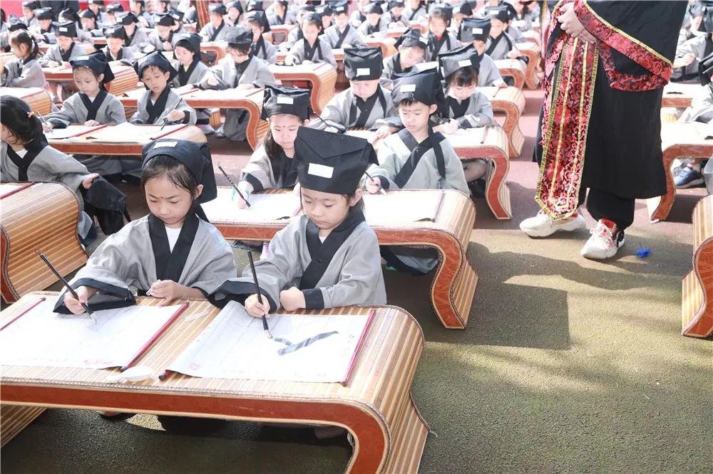 开笔礼上,学子要在师长的教导下学写第一个汉字“人”字。寓意学子们在人生的启蒙阶段学会堂堂正正的做人,明道理。孩子们在老师的指导下,拿着心爱的毛笔,工工整整的写下了第一个字,时刻提醒自己,在以后的生活中“先做人再做事”。