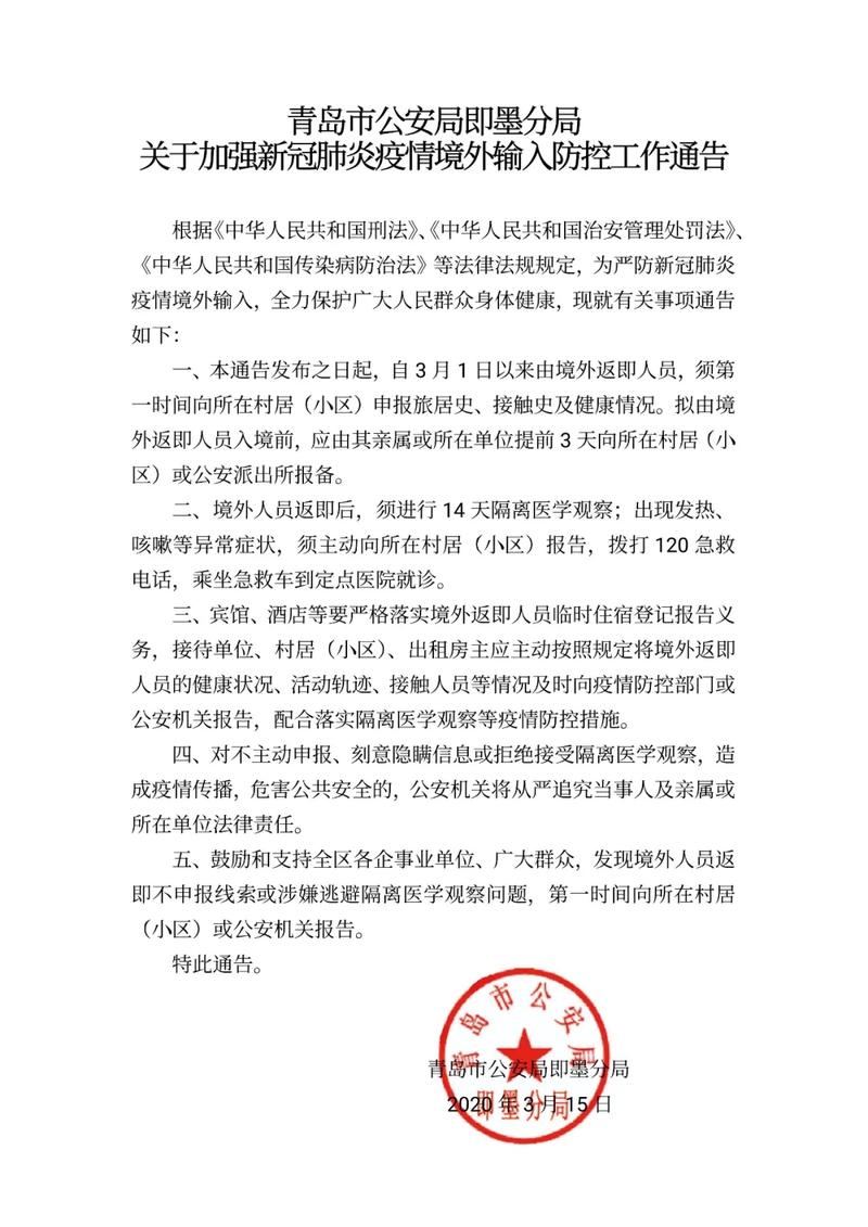 青岛即墨区发重要通告,拟由境外返回人员,入境前应提前3天报备。