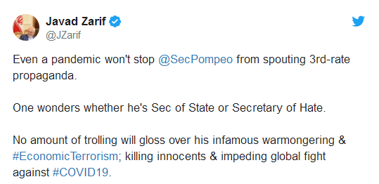 然而此番话说出没多久就遭到了扎里夫的抨击,他在个人账号上说道“全球疫情暴发都无法阻止蓬佩奥低端的政治宣传。”此处,他还特意@了蓬佩奥。扎里夫继续说道,“他到底是国务卿(Sec of State)还是仇恨的代表(Secretary of Hate)。再多的好处也无法掩盖其臭名昭著的好战行为、经济恐怖主义、滥杀无辜和阻碍全球同新冠肺炎做抗争。”
