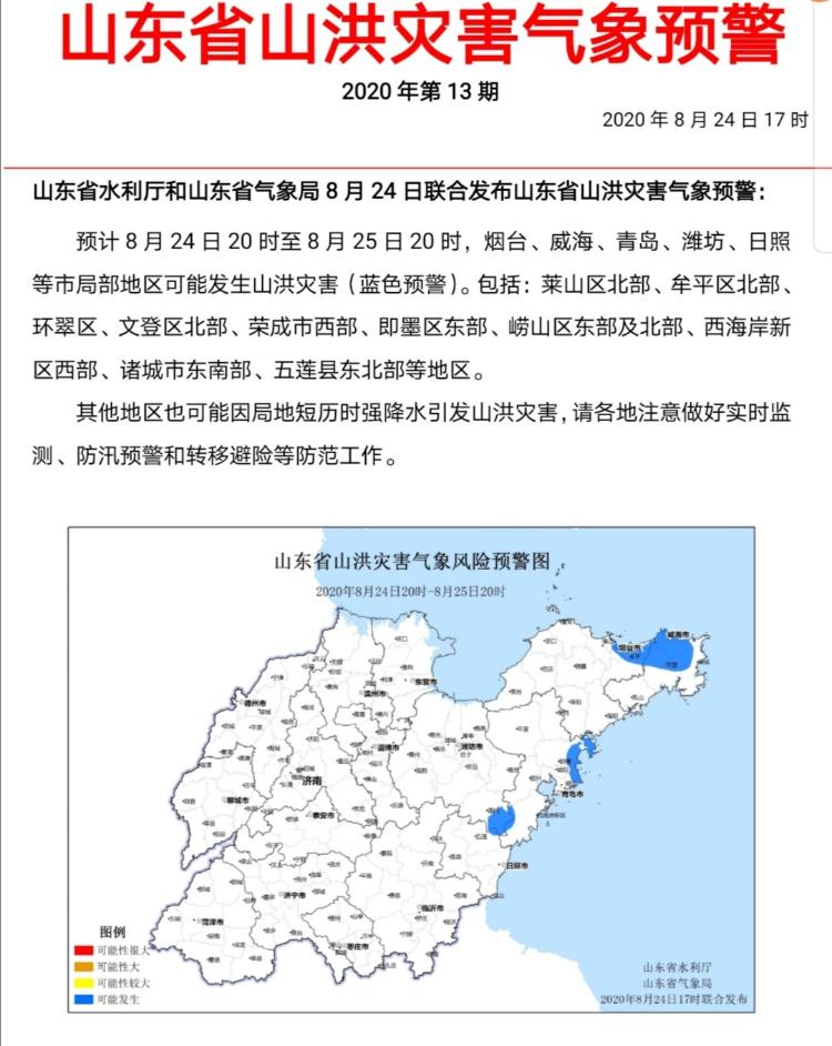 8月24日17时,山东省水利厅和山东省气象局联合发布山东省山洪灾害气象预警:预计8月24日20时至8月25日20时,烟台、威海、青岛、潍坊、日照等市局部地区可能发生山洪灾害(蓝色预警)。包括:莱山区北部、牟平区北部、环翠区、文登区北部、荣成市西部、即墨区东部、崂山区东部及北部、西海岸新区西部、诸城市东南部、五莲县东北部等地区。