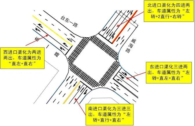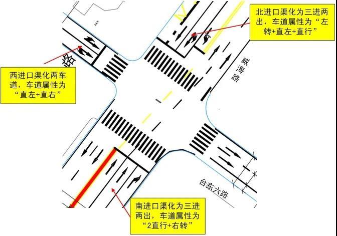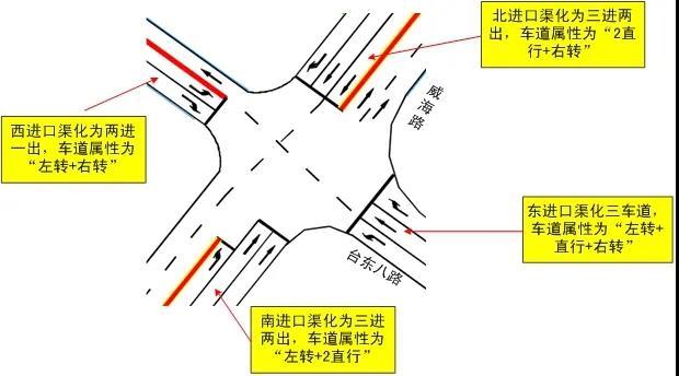 威海路(台东一路-长春路)路段施工结束,已恢复地面通车,为满足现有通行需求,沿线路口实施了新的交通组织优化: