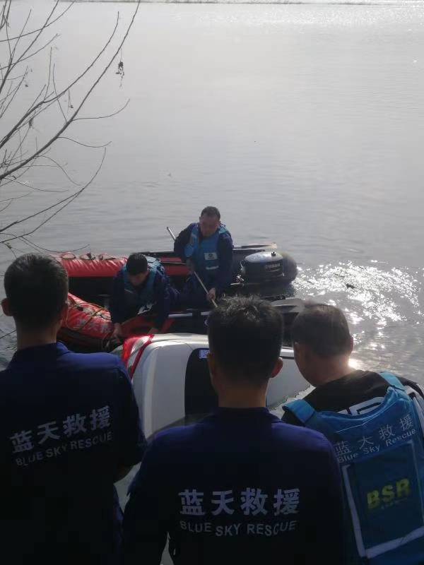 胶州蓝天救援队携带救援装备迅速赶到现场。车辆被水流带离岸边30多米远,仅露出部分车尾。救援人员驾驶冲锋舟迅速抵近查看,发现车内没有人。并立即在水面上展开搜寻,通过专业设备对水下进行探寻。