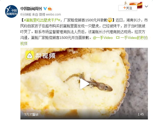近日,湖南长沙,市民称自家孩子在超市购买的蛋糕里面发现一只壁虎,已经被烤干,孩子当时就被吓哭了。联系市场监督管理局执法人员后,该蛋糕长沙代理商抵达现场。经双方沟通,蛋糕厂家赔偿顾客1500元并当面致歉。
