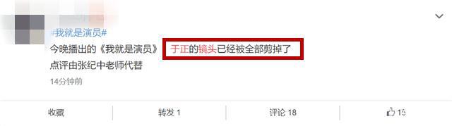 近日有网友发现,于正参加的综艺节目《我就是演员3》最新一期已经没有任何镜头,且前两期的正片也全部下架,关于于正的片段也全都消失。