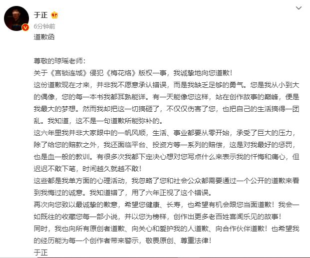 据悉,31日凌晨,郭敬明发文就《梦里花落知多少》抄袭庄羽《圈里圈外》道歉,承认自己的抄袭行为后,还答应和对方一起成立反剽窃基金会。而后,于正也发文就《宫锁连城》抄袭《梅花烙》一事向琼瑶道歉,并表示自己一直没道歉的原因是没勇气。