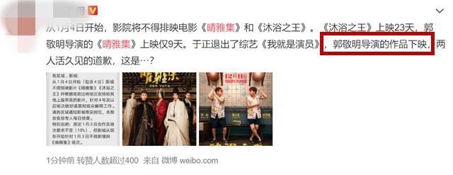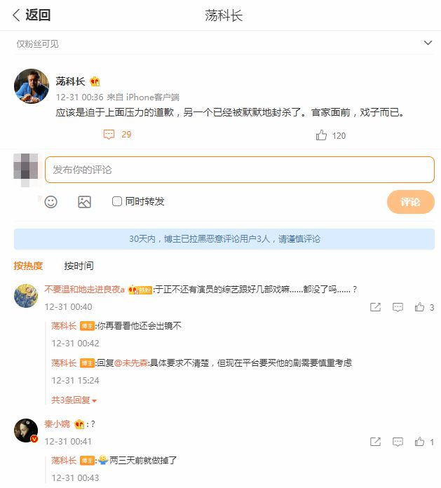 有电影博主爆料称:郭敬明是迫于压力的道歉,于正已被封杀。而有网友评论称“于正的综艺与戏也没了?”,他回复道:“再看看他还会出镜不?”,疑似坐实于正被封杀的消息。