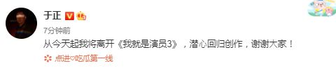31日,于正继续发文宣布退出综艺节目《我就是演员3》:从今天起我将离开《我就是演员3》,潜?回归创作,谢谢?家!疑似坐实了被封杀的消息。