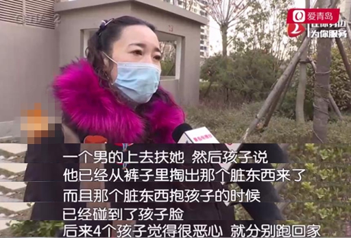徐女士:一个男的上去扶她,然后孩子说他已经从裤子里掏出那个脏东西来了,而且那个脏东西抱孩子的时候,已经碰到了孩子脸,后来4个孩子觉得很恶心,就分别跑回家。