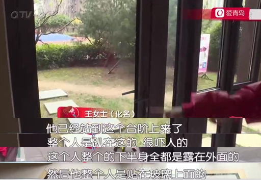 王女士(化名):他已经站到这个台阶上来了,整个人是趴在这的,很吓人的。这个人整个的下半身全都是露在外面的,然后他整个人是贴在玻璃上面的。