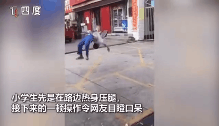 小学生路边热身压腿