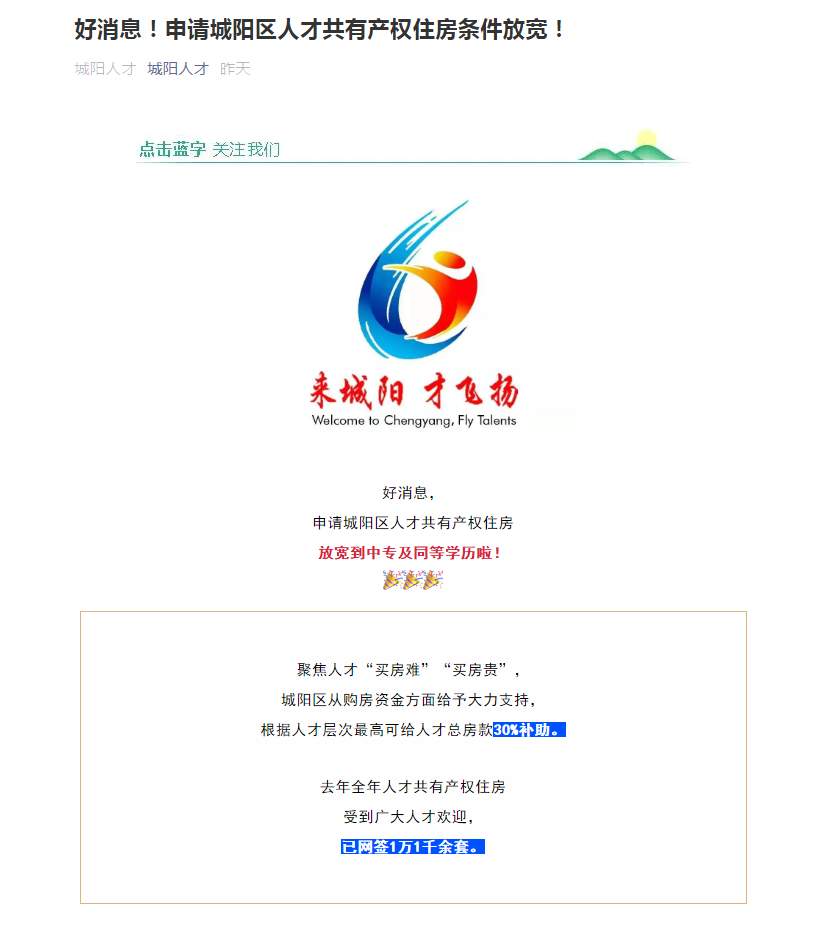 2月21日,据青岛市城阳区人力资源和社会保障局官方微信公众号“城阳人才”发布消息,申请城阳区人才共有产权住房放宽到中专及同等学历啦!